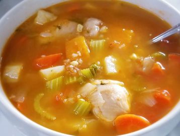 Caldo de pollo con chile guajillo, pechuga de pollo, arroz blanco y verduras.