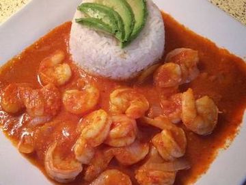 Camarones a la diabla preparados con adobo de chile Guajillo y chile de árbol, acompañado con arroz.