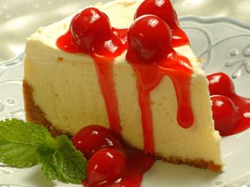 Cheese cake elaborado con queso crema sobre una base de galleta, bañado de almíbar de cereza.