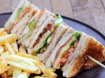 Club sandwich con jamón, pollo, tocino y ensalada acompanado de papas a la francesa.