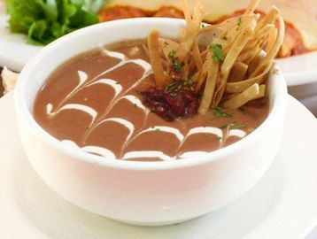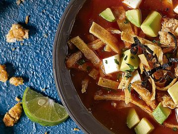 Sopa de tortilla con caldo de pollo y adobo de chile Guajillo acompañada de tortilla frita y crema.