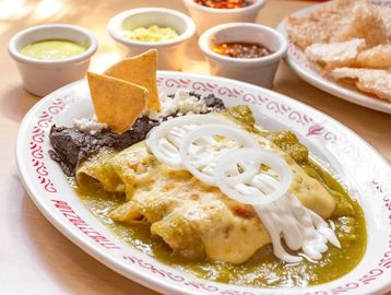 Enchiladas Suizas con pollo, crema, gratinadas acompañadas de frijoles refritos.