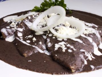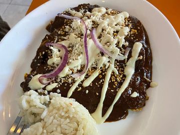 Enmoladas de pollo con crema acompañadas de arroz blanco y frijoles refritos.