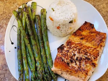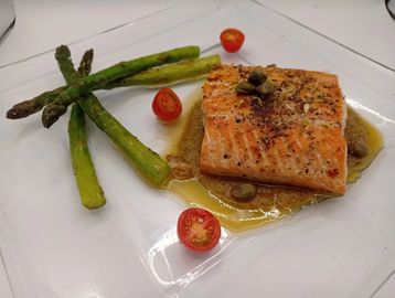 Filete de Salmón a la plancha con mantequilla, naranja, desglasado con vino blanco, acompañado de espárragos salteados.