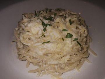 Spaguetti en salsa Bechamel cremosa y queso parmesano.