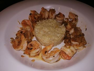 Camarones al ajillo salteados en mantequilla y desglaseado con vino blanco acompañado de arroz.