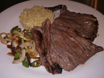 Arrachera de res a la plancha acompañada de frijoles refritos y arroz.