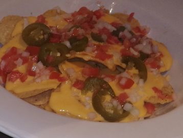 Crujientes nachos de maíz bañados de queso cheddar derretido, rodajas de chile jalapeño y pico de gallo.