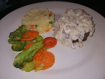 Filete de res en salsa Strogonoff de champignon acompañado de arroz y verduras salteadas.