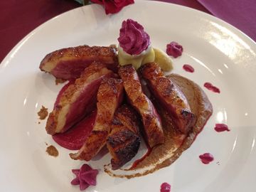 Magret de pato laqueado con salsa rosa y salsa de chocolate acompañado de puré de remolacha y almendra sobre un corazón de alcachofa salteado.