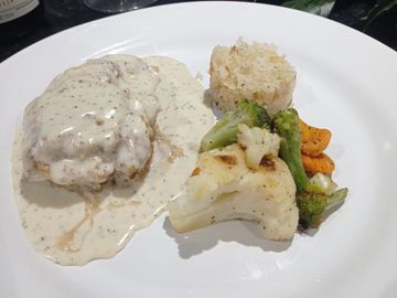 Muslo de pollo relleno de mousseline en salsa bechamel acompañado de verduras salteadas y arroz.