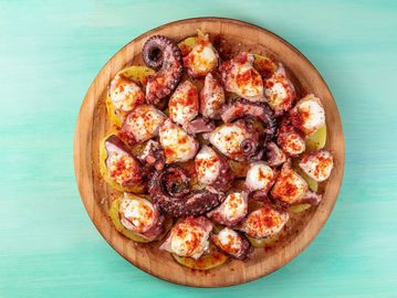 Tentáculo de pulpo con aceite de oliva, pimentón dulce y sal gruesa sobre una cama de papa.