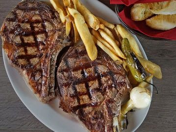 Rib-Eye a la parrilla acompañado de papas a la francesa y chiles toreados.