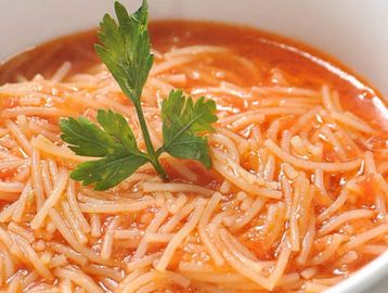 Sopa de fideo con caldo de pollo y sofrito de jitomate, cebolla y ajo.