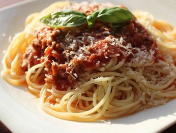 Spaguetti con carne de res bolognesa y queso parmesano.