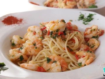 Spaguetti con camarones salteados en mantequilla y vino blanco.