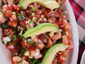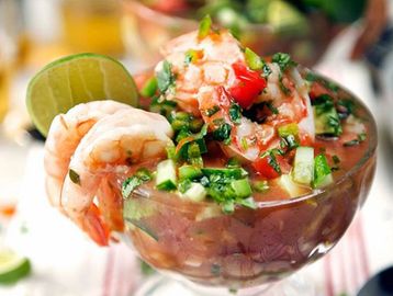 Botana de Camarón acompañado de nachos, pico de gallo y chile serrano.