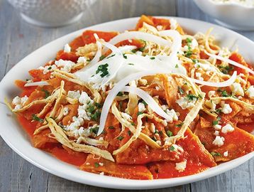 Chilaquiles rojos con pollo gratinados acompañados de cebolla y crema.