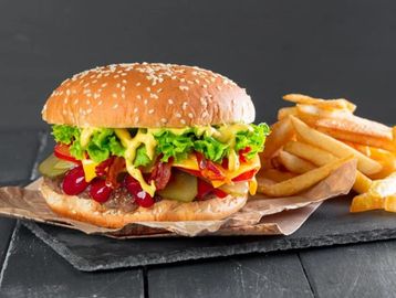 Hamburguesa con 200gr de carne de res, queso gratinado, lechuga, jitomate, cebolla acompañado de papas a la francesa.
