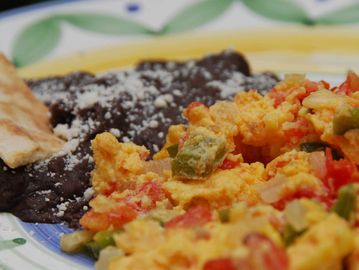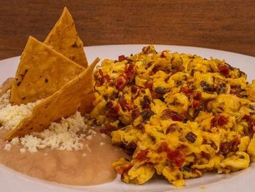 Huevo revuelto con jitomate, cebolla, chile serrano acompañado de frijoles refritos y papa hash.