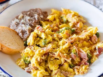 Huevo revuelto con jamón de cerdo acompañado de frijoles refritos y papa hash.