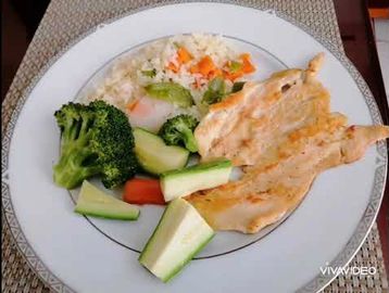 Milanesa de pollo natural a la plancha acompañada de ensalada verde con aceite, vinagre y arroz.