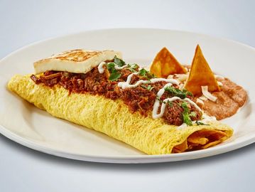 Omelette de huevo con jitomate, cebolla y chile serrano acompañado de frijoles refritos.